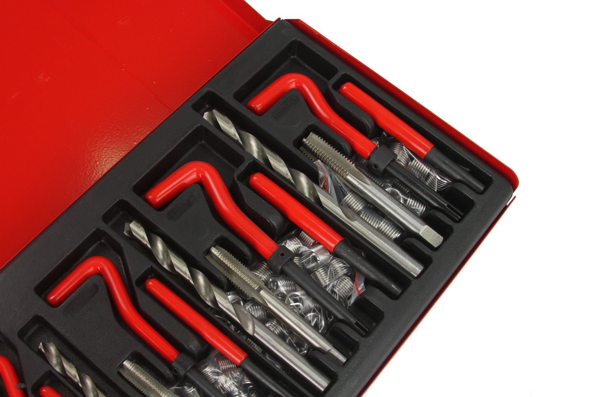 Táto profesionálna sada je ideálna pre autoservisy, dielne, ale aj pre domácich majstrov. Vďaka vysoko kvalitným závitníkom a vrtákom vyrobeným z ocele HSS poskytuje dlhú životnosť, presnosť a odolnosť. Sada obsahuje všetko potrebné pre rýchlu opravu závitov M5, M6, M8, M10 a M12 – vrtáky, závitníky, montážne prípravky a 125 závitových vložiek.