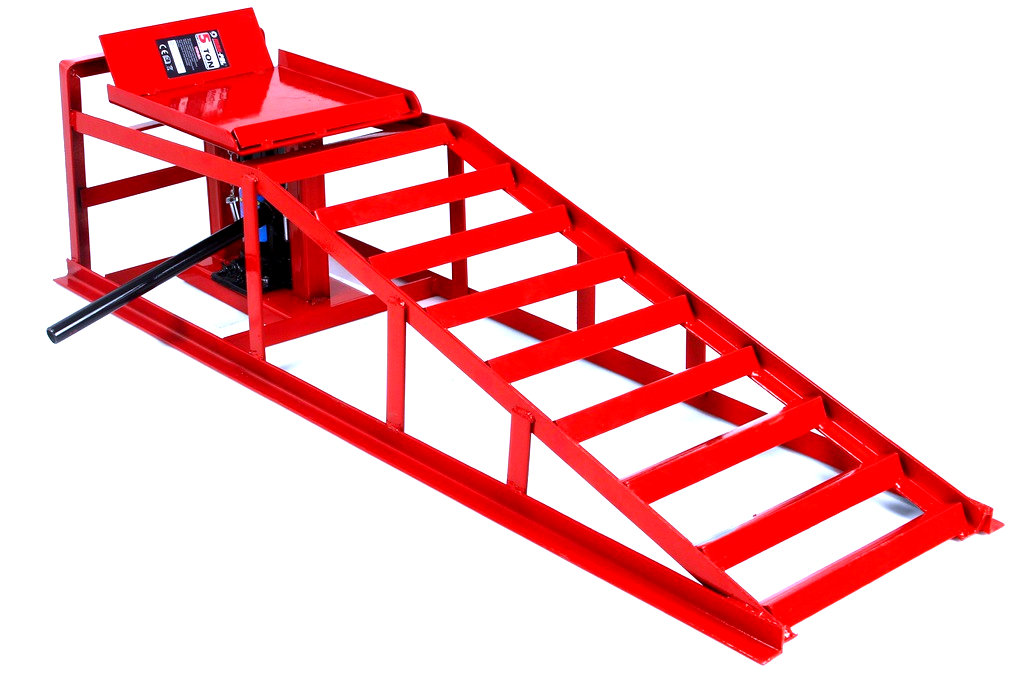 Sada dvoch najazdových rámp s hydraulickým zdvihákom pre osobné vozidlá. Nastaviteľná výška 23 – 34 cm, nosnosť 2000 kg, pevná oceľová konštrukcia. Obsahuje pravú aj ľavú rampu – ideálne pre servis, údržbu a domáce opravy.