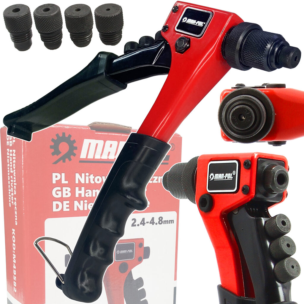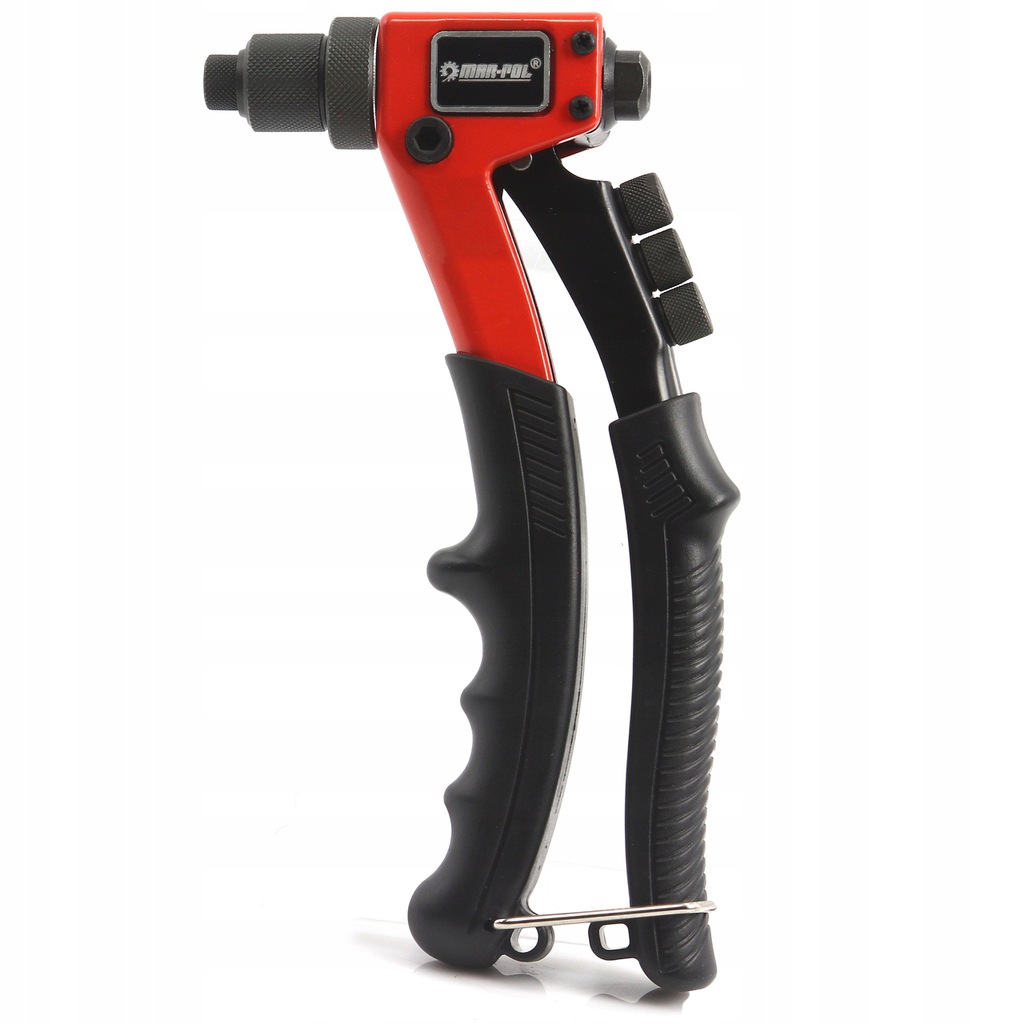Nitovacie pákové kliešte MAR-POL M49582 s rozsahom 2,4 - 4,8 mm, zosilnená kovová konštrukcia a ergonomické pogumované rukoväte pre pohodlné používanie v profesionálnych aj domácich dielňach.