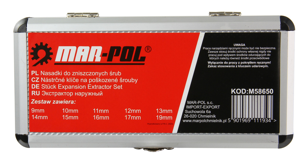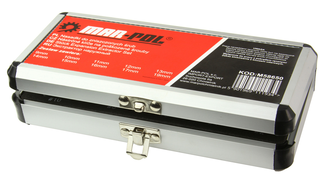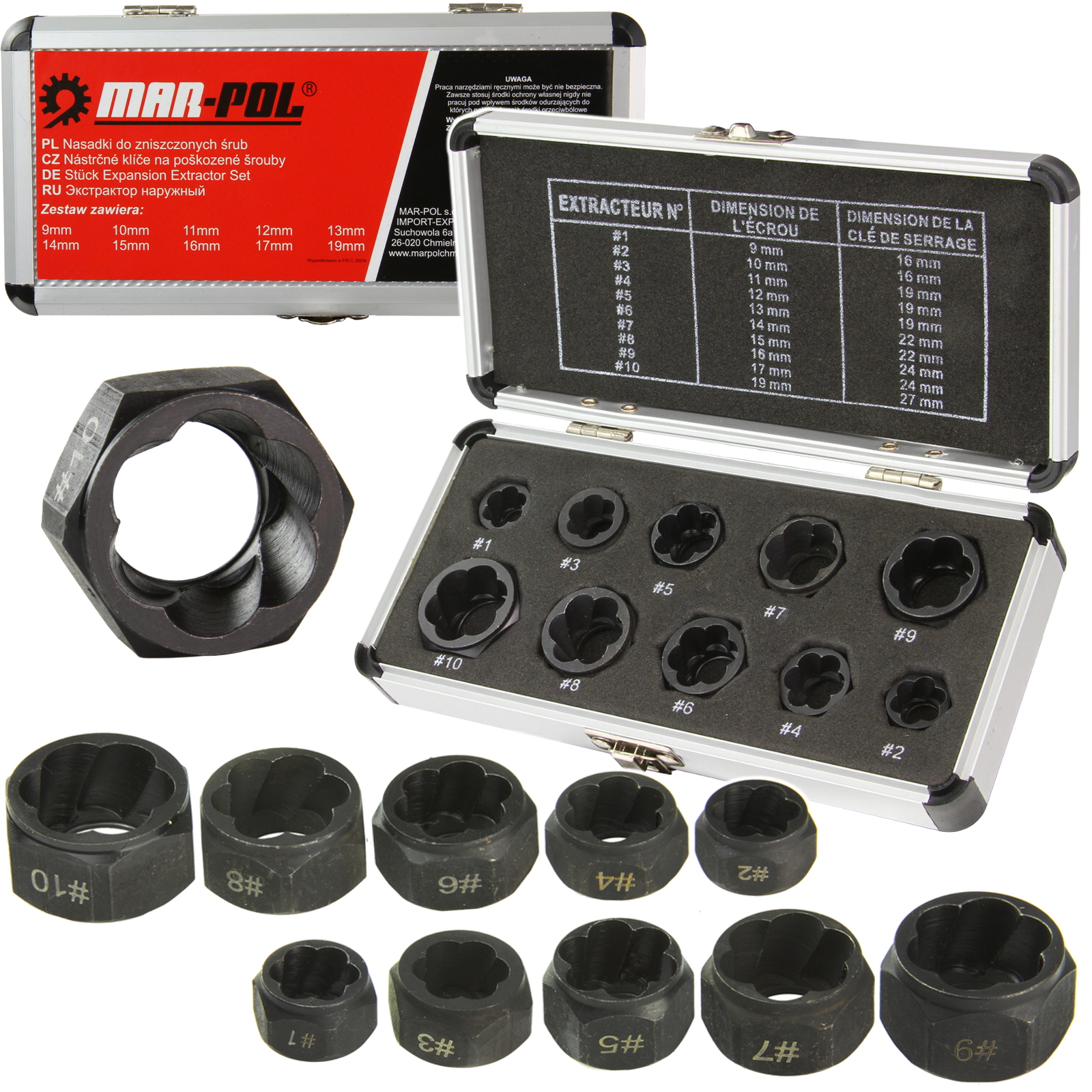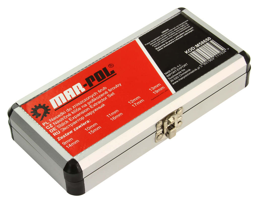 - Obrobené, alebo poškodené hlavy skrutiek sú bežným javom, ktorý zastaví prácu a zabráni vybratiu poškodeného komponentu. Najlepším riešením je v tomto prípade použiť prvky tejto sady. Nástrčné hlavice majú vo vnútri špeciálny tvar, ktorý umožňuje, aby sa profilované hrany zarezali do hlavy spracovávanej skrutky, účinne ju zablokovali a odskrutkovali. To vám umožní ľahko odskrutkovať skrutky, s ktorými sa pomocou štandardných nástrojov prakticky nedá pohnúť. Z vonkajšej strany majú nádstavce štandardný šesťhranný výrez prispôsobený na prácu s plochými kľúčmi, očkovými kľúčmi a nástrčnými kľúčmi, vďaka čomu sú mimoriadne univerzálne pri použití.