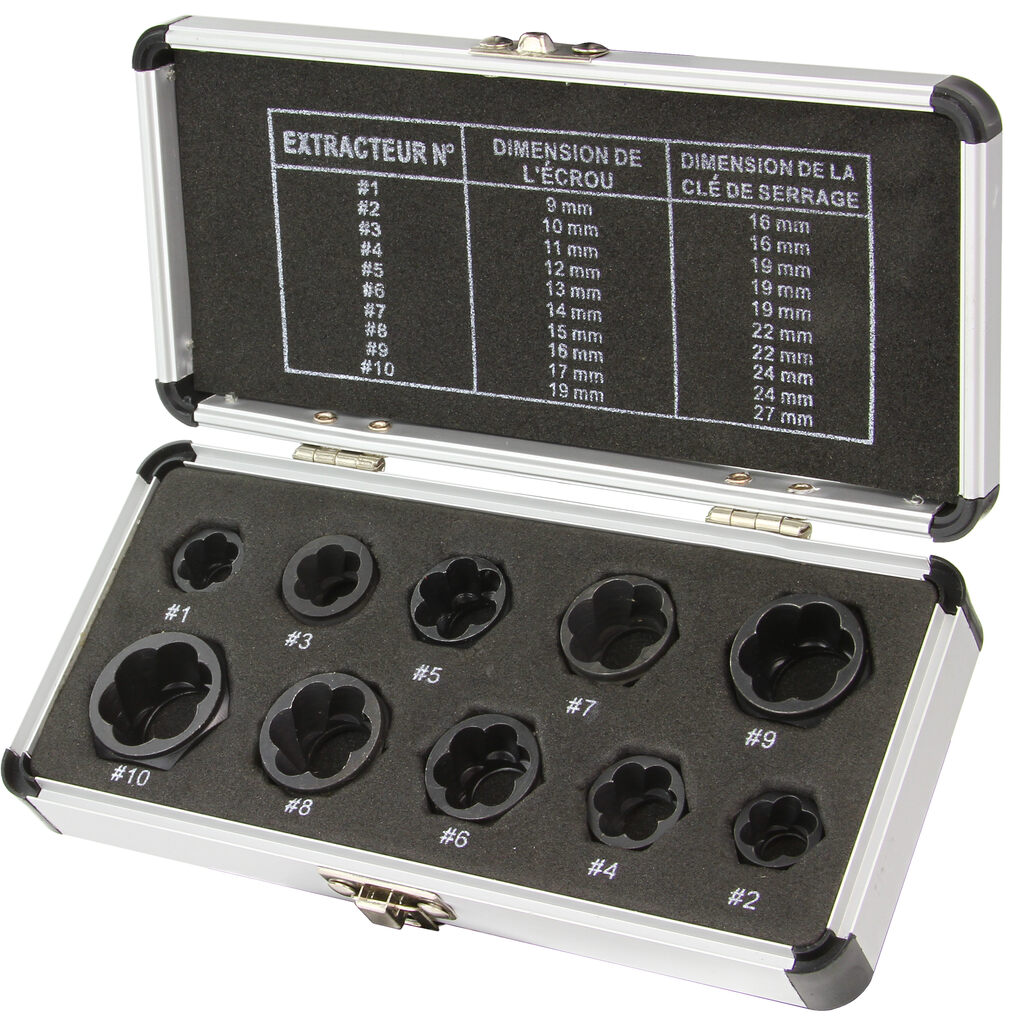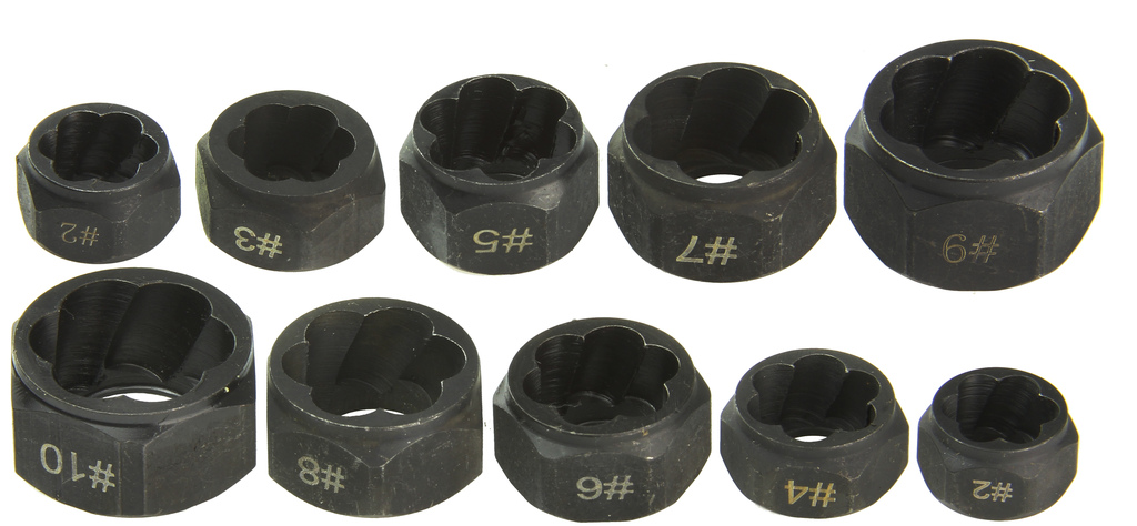 Sada špeciálnych nádstavcov k povoľovaniu poškodených skrutiek a matíc (krátke). Vnútro hlavice má špeciálny špirálovitý tvar, ktorý umožňuje zarezávať sa do hrany profilovanej hlavy poškodenej skrutky a efektívne ju odskrutkovať.