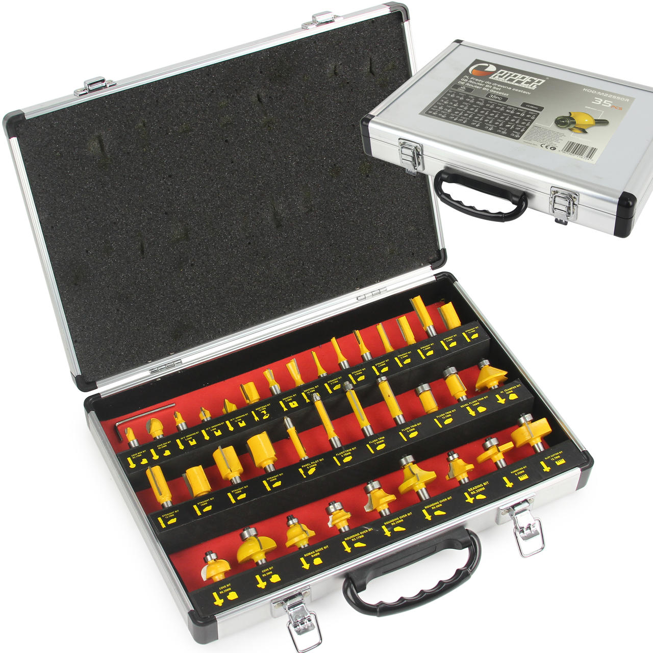 Sada 35 kusov stopkových fréz na drevo s ložiskom. Frézy na drevo umožňujú opracovať daný prvok s presnosťou 0,08 mm. Používajú sa napríklad v stolárskych dielňach vyrábajúcich nábytok alebo závodoch špecializovaných na presné spracovanie dreva.