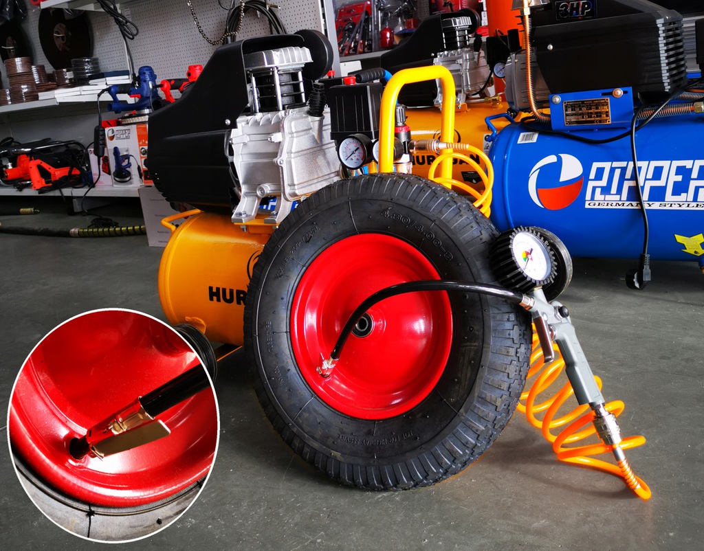 🔹 Nafukovacia pištoľ s manometrom (16 bar) – Umožňuje presné hustenie pneumatík, matracov a loptičiek.