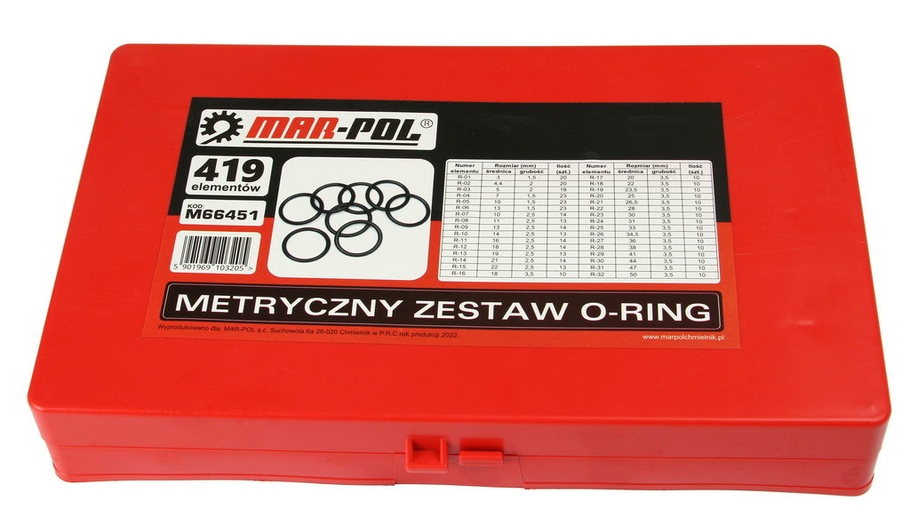 Sada tesniacich O-krúžkov MAR-POL M66451 obsahuje 419 ks v 32 veľkostiach. Odolné voči chemikáliám, olejom a vysokým teplotám. Ideálne pre použitie v automobilovom priemysle, servisoch a dielňach.