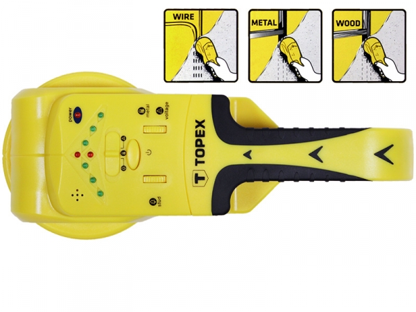 Detektor 3 v 1 TOPEX 94W120 je praktický nástroj určený na rýchlu a presnú detekciu dreva, kovov a elektrických káblov pod napätím. Vďaka nastaviteľnej presnosti meraní ponúka spoľahlivé výsledky pri práci v domácnosti aj na stavbe. O detekcii materiálu informuje svetelný a zvukový signál, čím zvyšuje bezpečnosť pri vŕtaní a inštalácii. Napájaný 9V batériou a vybavený certifikátom CE, zaručuje bezpečné a jednoduché používanie.