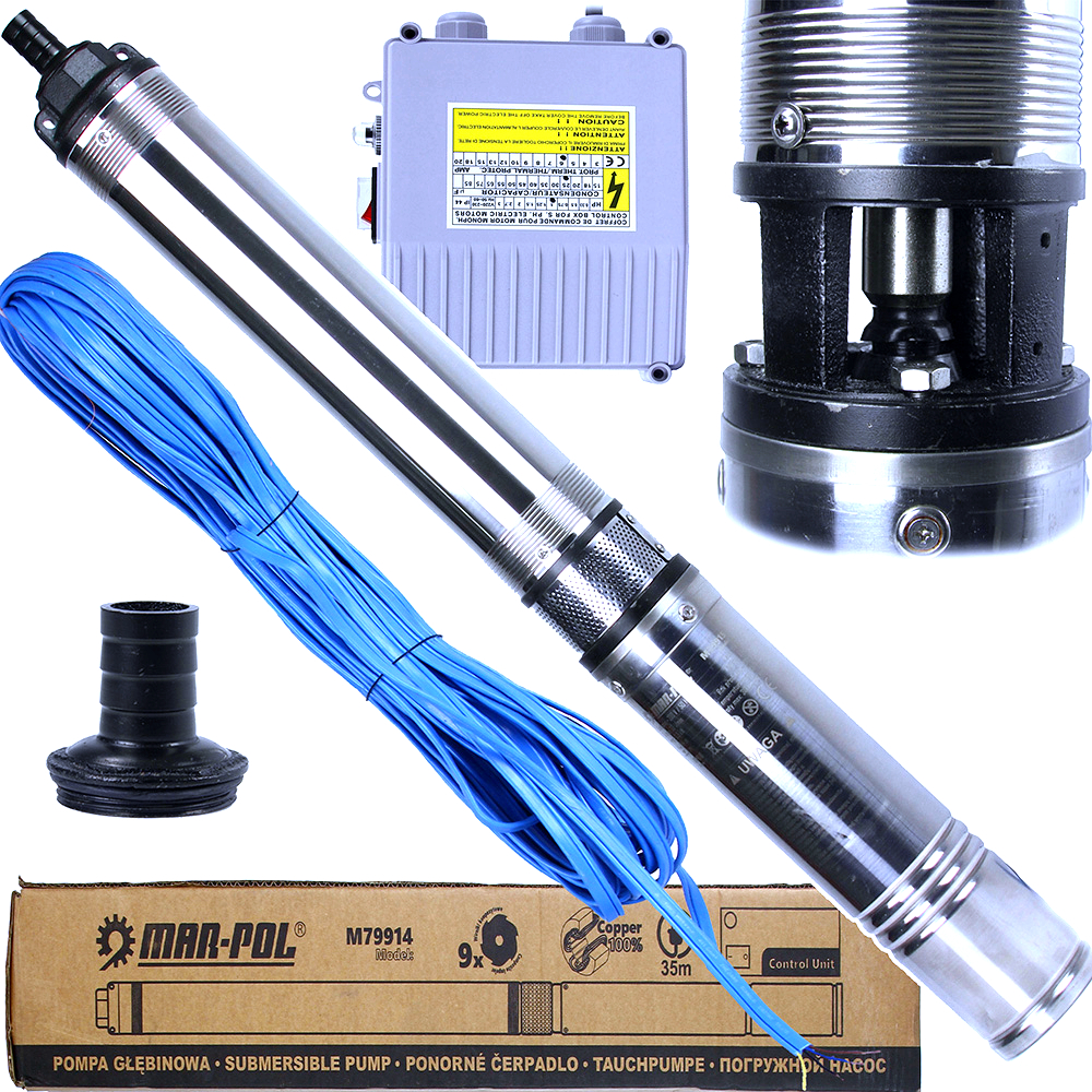 Hlbinné čerpadlo na vodu 4QJD 750 W + CONTROL BOX MAR-POL M79914 je výkonné ponorné čerpadlo, ktoré umožňuje efektívne čerpanie vody z hlbokých studní. Motor dosahuje otáčky až 2 850 ot/min, čo zabezpečuje prietok až 33 litrov za minútu. Maximálna výška zdvihu je 63 m, čo robí toto čerpadlo ideálne na prácu v hlbokých studniach alebo v hydrofórových systémoch. Motor je hermeticky uzavretý a naplnený olejom, čo zabezpečuje lepšie chladenie a ochranu pred vlhkosťou a koróziou. Kryt čerpadla je vyrobený z nehrdzavejúcej ocele (INOX), čo zaručuje dlhodobú odolnosť. Riadiaca skrinka zabezpečuje jednoduchú obsluhu a obsahuje nadprúdový spínač, ktorý zabraňuje poškodeniu prístroja v prípade prepätia. Sada obsahuje 35 metrový napájací kábel, ktorý umožňuje pohodlnú inštaláciu bez potreby predlžovania.
