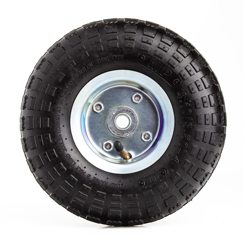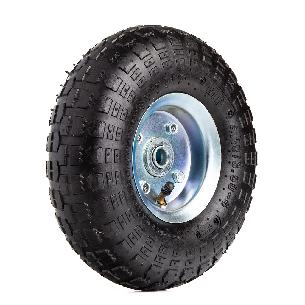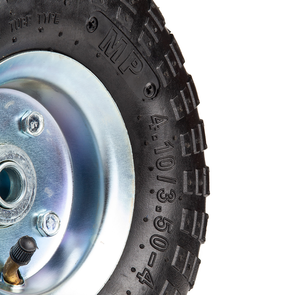 Univerzálne nafukovacie koleso s kovovým diskom, nosnosť 136 kg, ideálne na štrk, trávu a blato. Vhodné pre fúriky a vozíky. Priemer otvoru 16 mm.