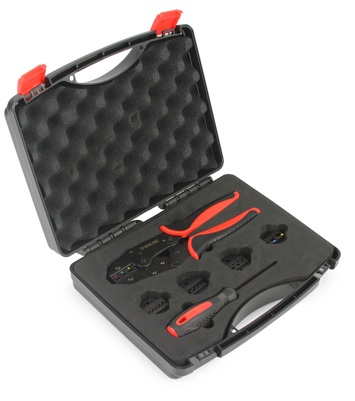 Sada obsahuje 5 vymeniteľných matríc, ktoré umožňujú lisovanie rôznych druhov konektorov. Krimpovacie kliešte majú nastaviteľný račňový mechanizmus, ktorý zabezpečuje rovnomerný tlak pri lisovaní. Ergonomická rukoväť umožňuje pohodlné a presné ovládanie pri práci.
