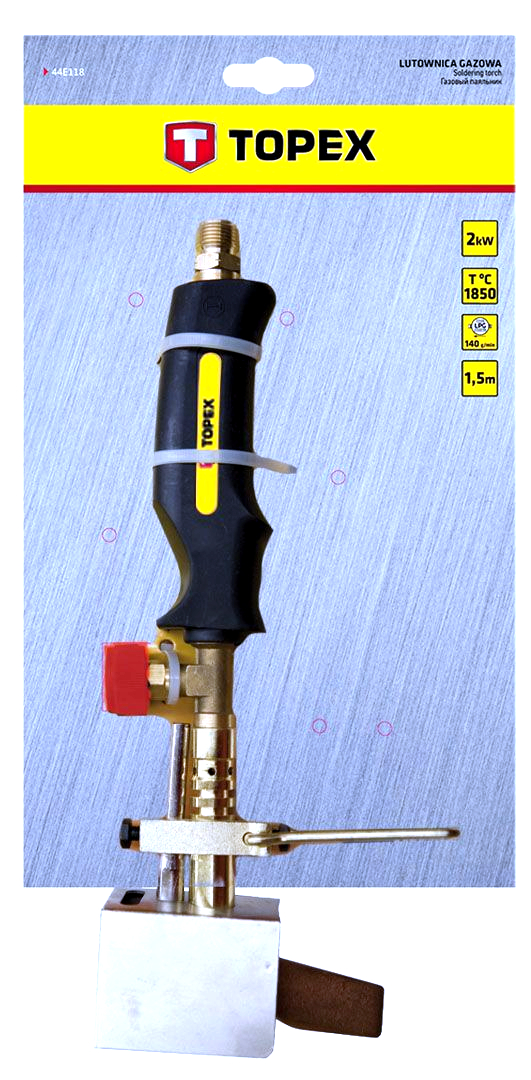 Plynová spájkovačka TOPEX (ref. 44E118) s výkonom 2 kW, prevádzková teplota 1850°C. Sada obsahuje gumenú hadicu s dĺžkou 1.5 m.
